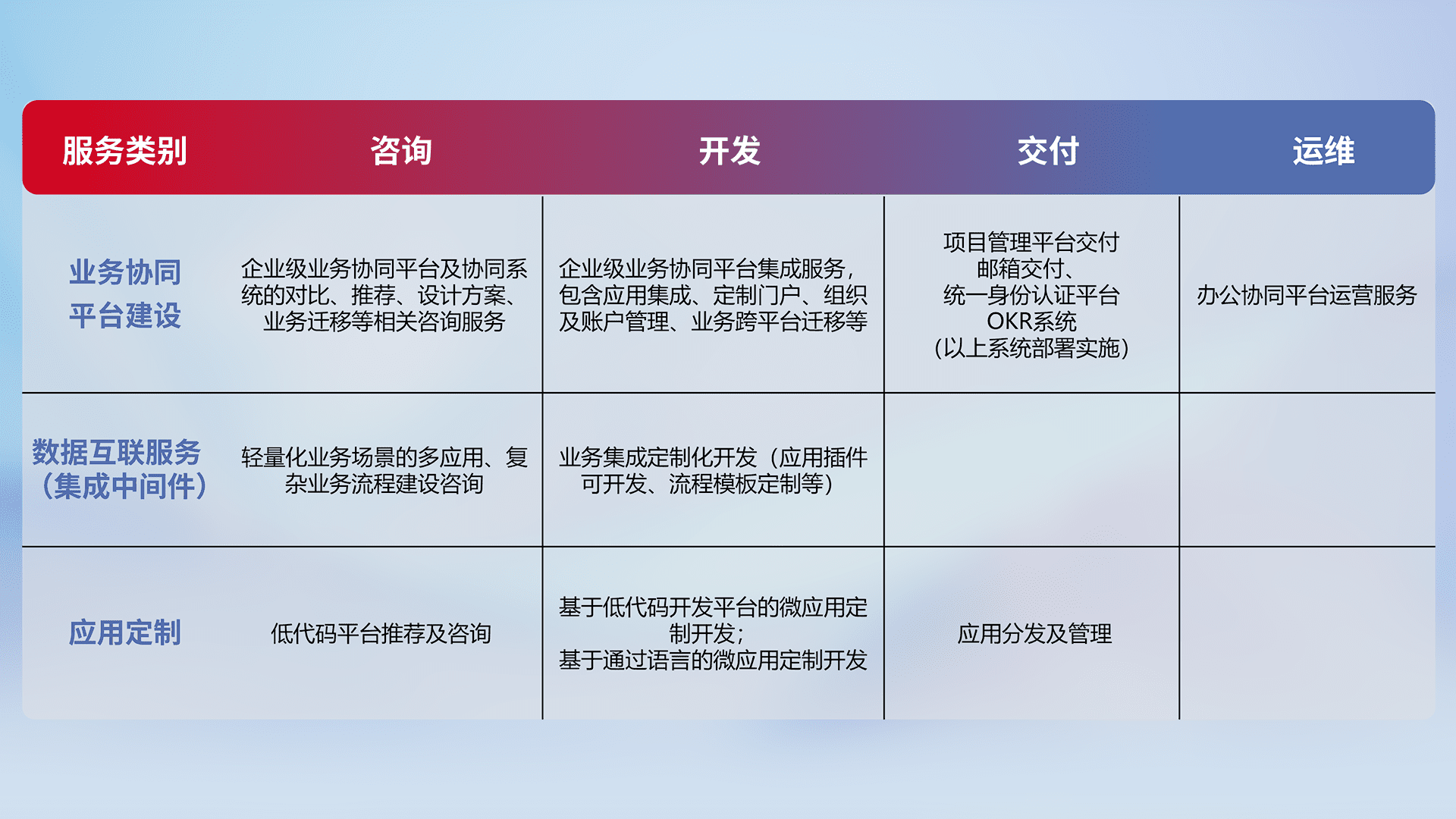 针对钉钉、、企微、、IDaas等平台级产品提供产品的规划、、、、方案、、、交付、、定制化开发等服务,,实现如统一协同办公、、、、智能客户服务、、、混合会议管理、、、智能数据查询、、、、等业务场景,,实现数字化转型。。
