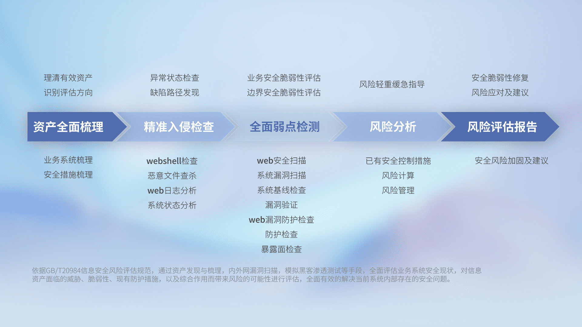针对客户行业特性,,以专业的安全服务+多厂商联合解决方案提供专属的一站式安全管理服务,,,帮助客户全面感知网络空间威胁,,,基于识别、、、、检测、、分析、、防护、、监测、、、、响应的服务理论模型,,,,从方案咨询、、、、集成交付、、、评估验证、、、、优化加固、、、、运维运营,,致力于为客户提供完整的闭环管理式安全服务。。。。以实战经验为客户打造高抵御风险的安全体系,,帮助客户发现威胁、、、、对抗威胁、、处置威胁,,,不断积累安全对抗能力,,,持续保障数字化安全。。